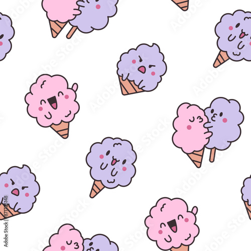 Cute kawaii cotton candy with a smile. Seamless pattern. Sweet sugar cartoon food character. Hand drawn style. Vector drawing. Design ornaments.