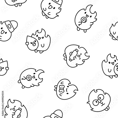 Cute kawaii fire character. Seamless pattern. Coloring Page. Hot cartoon flame energy. Hand drawn style. Vector drawing. Design ornaments.