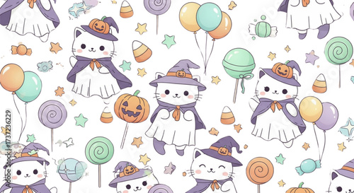 Cute Kawaii Halloween Cats Seamless Pattern Pastel Witch Costumes, Pumpkins, Candy, Balloons Background