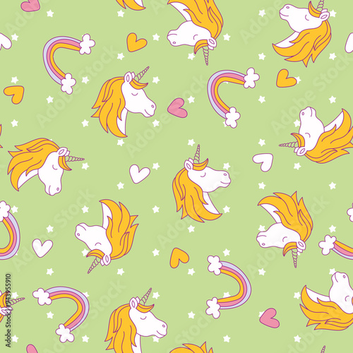 Cute kawaii little unicorn. Seamless pattern. Fairy tale cartoon happy pony characters. Hand drawn style.