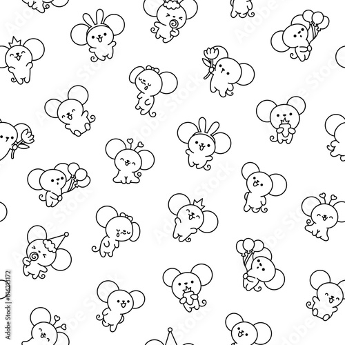 Cute kawaii mouse. Seamless pattern. Coloring Page. Cartoon happy baby rat characters. Hand drawn style. Vector drawing. Design ornaments.