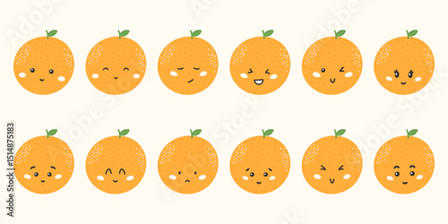 Cute kawaii orange vector stickers with funny faces and emotions: happy, sad, angry, surprised. Flat characters for kids, education, and healthy eating designs