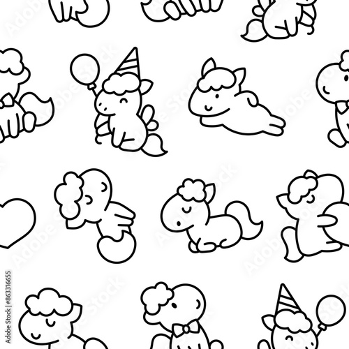Cute kawaii pony. Seamless pattern. Coloring Page. Cartoon funny baby horse characters. Hand drawn style. Vector drawing. Design ornaments.