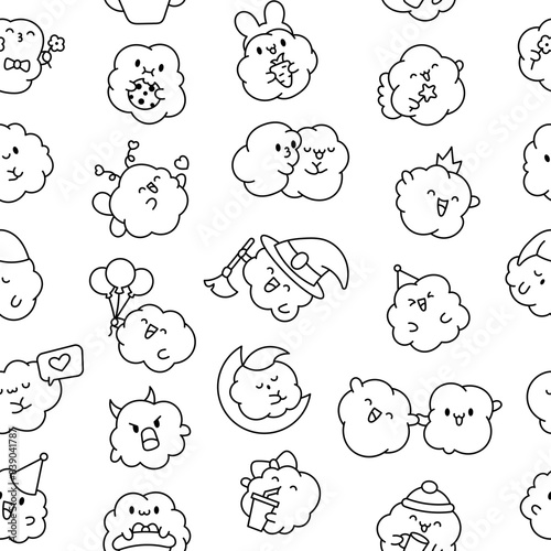 Cute kawaii popcorn with a smile. Seamless pattern. Coloring Page. Cartoon funny food character. Hand drawn style. Vector drawing. Design ornaments.