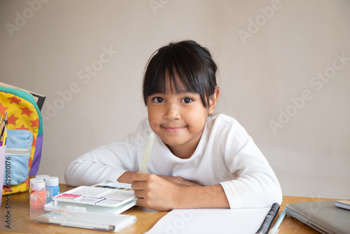 Cute kid drawing with water colour. Little girl writing something in copybook and sitting at table.