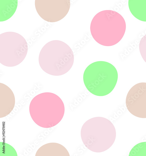 Cute kids polka dot colorful seamless vector pattern with glittering gold and solid pastel shades pink, green and beige dots and circles on solid white background.