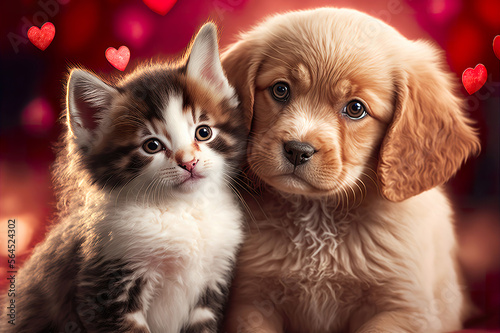 Cute kitten & puppy surrounded with hearts made by generative ai