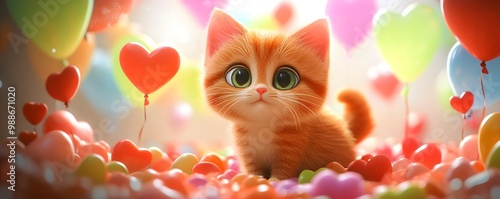 Cute Kitten with Heart Balloons for Valentine s Day