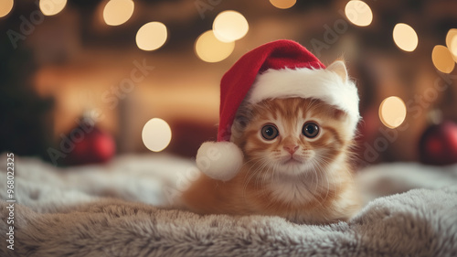 cute kitting with santa hat indoors, christmas interior. Cute pet, cat wearing a red santa claus hat during christmas time. Christmas decoration. Background for christmas greeting card, invitation car