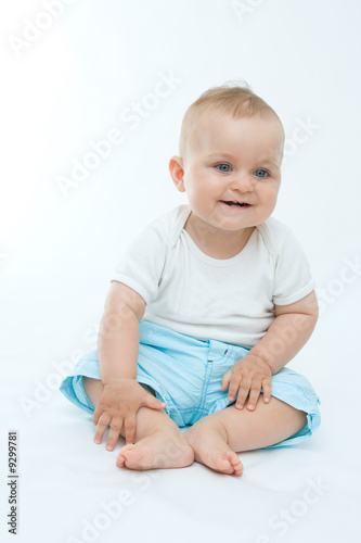 cute laughing baby boy sitting on white background