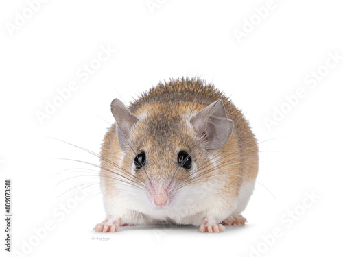 Cute light brown Cairo spiny mouse aka acomys cahirinus, standing side ways. Looking straight to camera showing both eyes. Isolated on a white background.