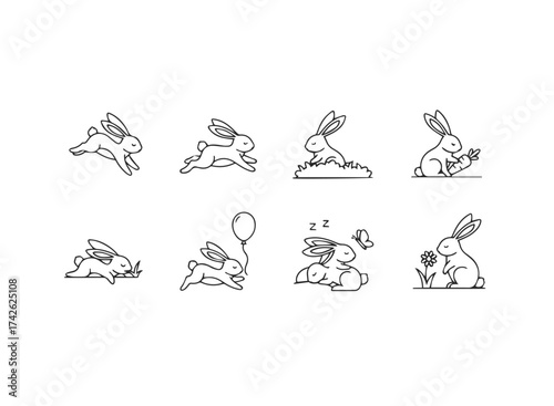 Cute Line Art Bunny Rabbit Icons Collection.