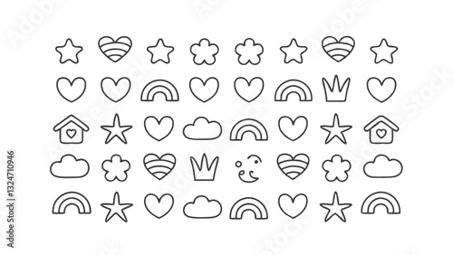 Cute Line Art Icons Hearts, Stars, Rainbows, Crowns, Clouds, Homes