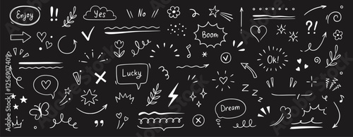 Cute line sketch star, arrow, heart decoration element icon set. Hand drawn sketch doodle cute star, emphasis, flower element. Pen line text decoration shape icon. Chalkboard vector illustration.