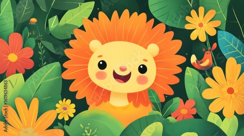 Cute lion character amidst colorful flowers and leaves. Joyful, playful, vibrant jungle scene.