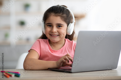 Cute Little Arab Girl Wearing Wireless Headphones Using Laptop At Home