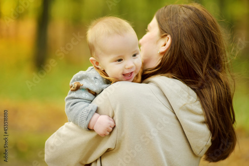 Cute little baby boy in his mothers arms. Mom and son having fun on sunny autumn day in city park. Son being held by his mommy.