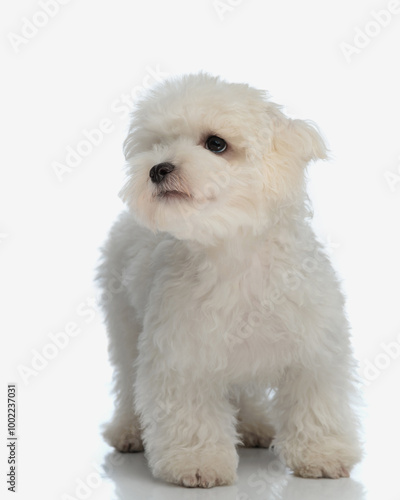 cute little bichon maltese puppy looking up side and walking