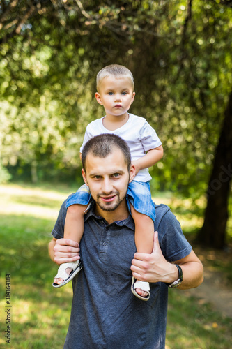 Cute little boy and his handsome young dad are looking forward and smiling while resting in the park. Son is sitting pickaback