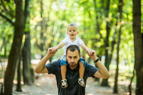 Cute little boy and his handsome young dad sitting on his father's shoulders while resting in the park.