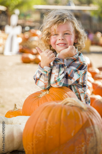 Cute Little Boy Gives Thumbs Up at Pumpkin Patch