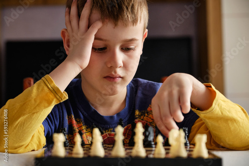 Cute little boy plays chess. Education concept, intellectual game. Concentrated boy developing chess strategy. Chess tournament, lesson, training.
