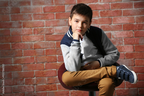 Cute little boy sitting on a chair near brick wall