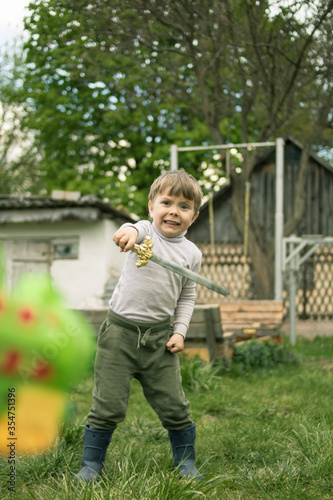 Cute little boy with a sword in his hands plays in nature