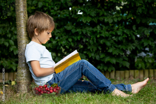 Cute little child, boy with pet dog, maltese breed, reading a book in garden, summertime, eating cherries