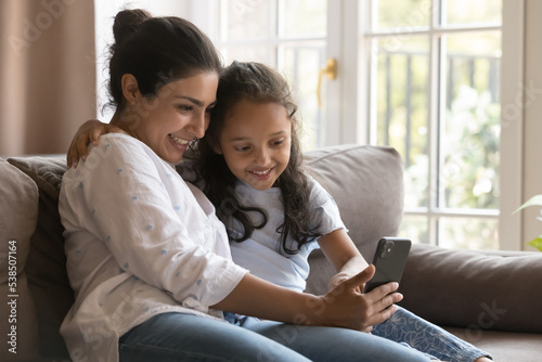 Cute little girl and mom having fun use modern smartphone, spend time on-line, making video call to friend smiling staring at cellphone camera enjoy new mobile application. Internet usage, technology