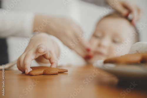 Cute little girl grabbing freshly baked gingerbread cookie on wooden table close up. Authentic lovely moment, holiday preparations. Adorable toddler girl making christmas cookies with mother