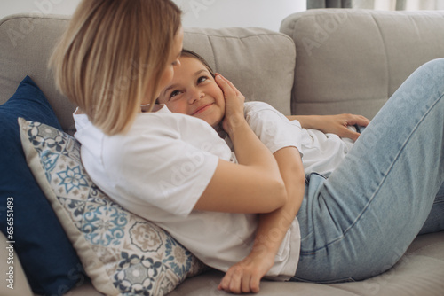 Cute little girl hug cuddle excited young mum show love and affection, smiling mother and funny small daughter have fun at home embrace sharing close tender moment together.