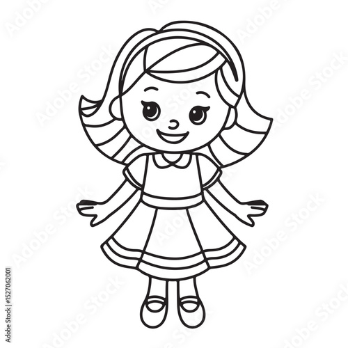 Cute Little Girl in Dress Line Drawing – Black and White Cartoon Illustration for Coloring Pages
