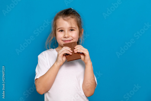 Cute little girl in white t-shirt eating chocolate bars with nuts on blue background, closeup. The concept of children's happiness and love for sweets