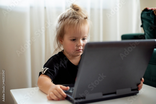 Cute little girl playing with plastic computer toy. Toddler with educational toys laptop for children