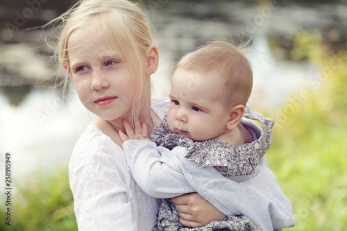 Cute little girls sisters outdoor (1 and 8 eyears old)