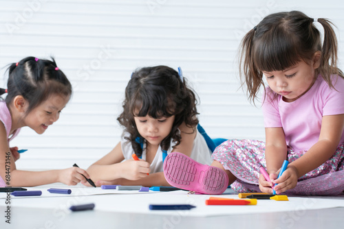 Cute little kid girl concentrate with using two hands drawing on paper while sitting and lying on floor with friends. Adorable happy children drawing with colorful crayons at school. Education concept