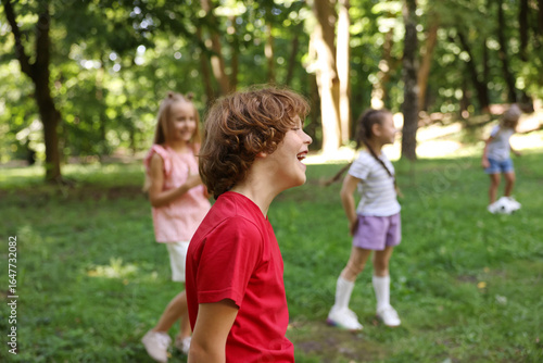 Cute little kids having fun together in park, selective focus