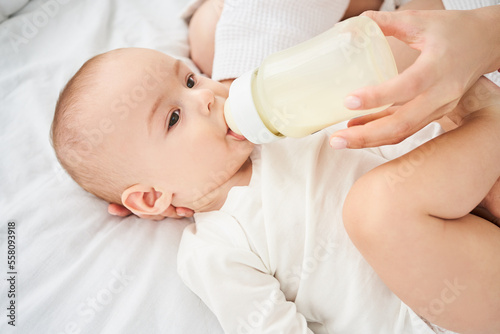 Cute little newborn boy eats milk from a bottle, a nipple.
