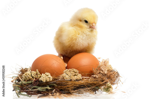 Cute little newborn chicken standing in nest with eggs, isolated on white background. Newly hatched chick on a chicken farm.