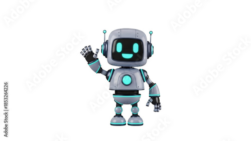 Cute little robot waving hello with a friendly smile, 3d rendering, isolated on transparent background