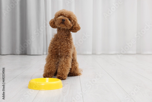 Cute Maltipoo dog near feeding bowl indoors, space for text. Lovely pet
