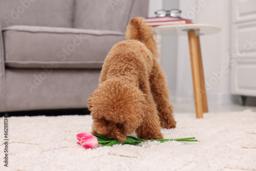 Cute Maltipoo dog with beautiful tulips at home. Lovely pet