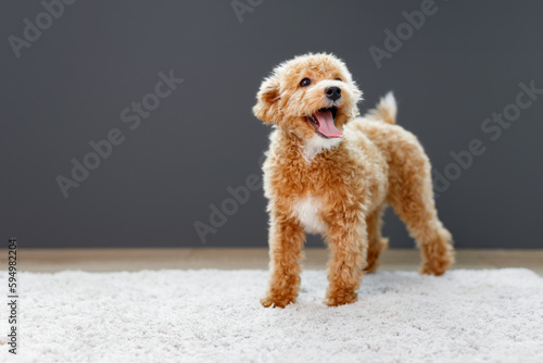 Cute Maltipoo puppy is resting in a modern interior. Beloved pet in the natural atmosphere of a beautiful home.
