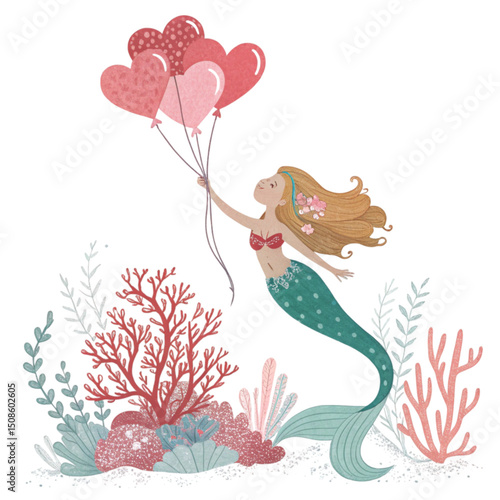 Cute mermaid Holding a heart balloons Whimsical Hand-Drawn Clipart Minimal , White Background