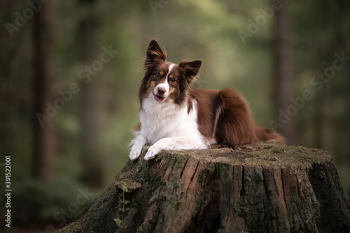 Cute miniature shepherd lying on a tree stem with forest in the background looking at the camera