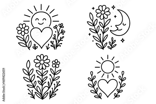 Cute nature line art set with sun, moon, heart, and flowers. Whimsical boho doodle collection for logo, tattoo, or sticker. Minimalist vector floral and celestial icons.