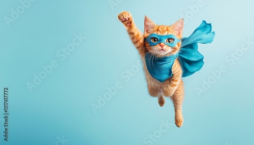 Cute Orange Tabby Cat Wearing Blue Cape Flying Midair
