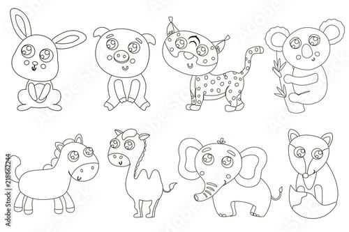 Cute outlined animals for coloring. Vector illustration.