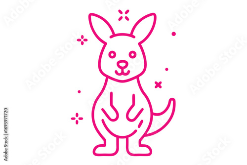 Cute outlined pink kangaroo standing cheerfully among simple sparkling design elements and dots